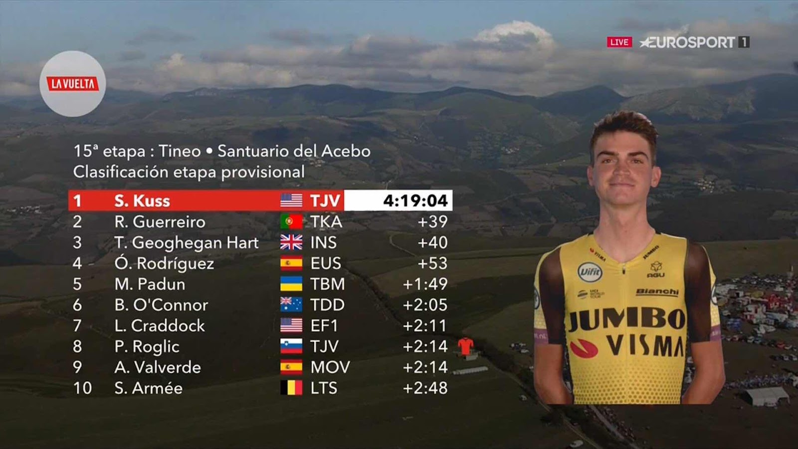 Más allá del movimiento de Valverde y de la fortaleza de Roglic, que ha colaborado con el ciclista del Movistar porque también le interesaba sacar más tiempo a sus otros rivales, la etapa ya decepcionado. Poco más hemos visto. Tan solo la batalla por la victoria parcial, siempre interesante también. En ella el mejor ha sido Kuss, que suma así su primera victoria de la temporada. El estadounidense, de 24 años, es otro de esos corredores jóvenes, otro más, cuyo futuro parece estar plagado de posibilidades de éxito. El tiempo dirá. Otro joven con prometedor futuro y prestaciones ya en el presente es Marc Soler, componente igualmente de la fuga, que ha echado una mano a Valverde en la parte final de la ascensión al Acebo. Soler termina las grandes vueltas muy bien, lo que invita a pensar que a partir del próximo año podrá dar un paso adelante en las carreras de tres semanas.