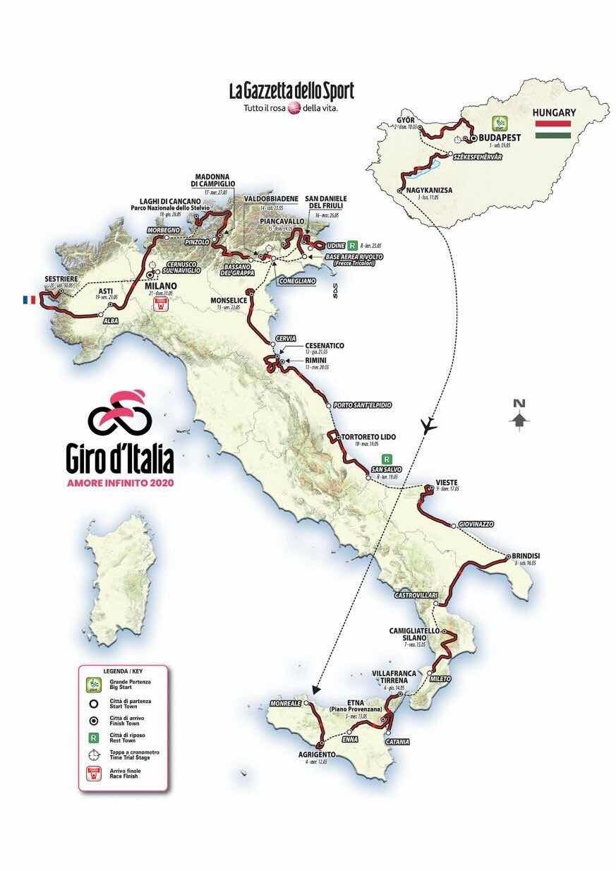 Después de la crono inaugural en Budapest el sábado 9 de mayo, el Giro disputará dos etapas más por tierras húngaras, sendas oportunidades para los velocistas. Sin un día de descanso por medio, en la cuarta etapa la carrera entra en Italia, con una jornada con final cuesta arriba en Agrigento. Al día siguiente, primer gran final en alto, con el Etna. En eso sí se parece el Giro con las otras grandes vueltas, en adelantar cada vez más la primera jornada montañosa. La primera semana de carrera tendrá aún otro final en alto, en Camigliatello Silano, en la séptima etapa.