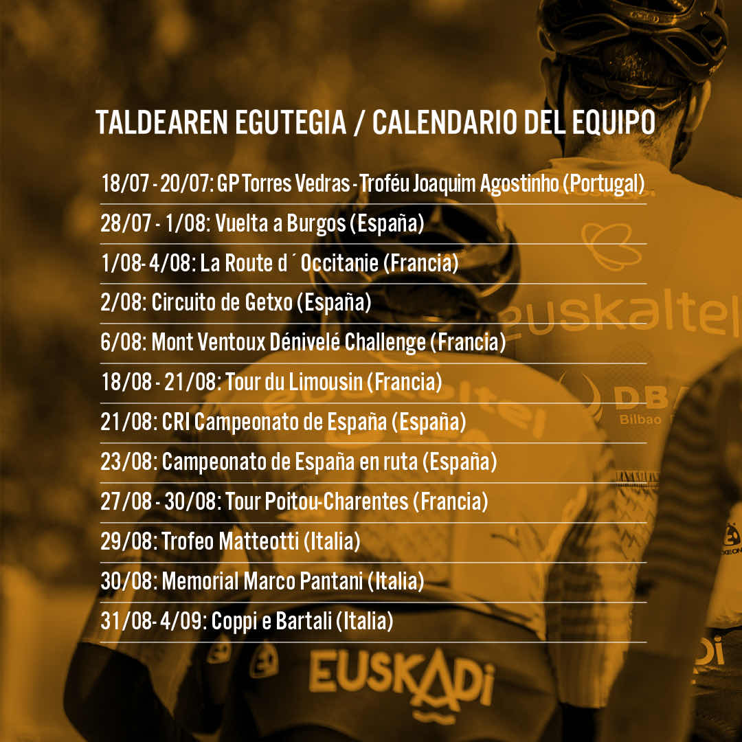 Todo empezará en Portugal, con el GP Torres Vedras, a mediados de julio. Después el equipo participará el la Vuelta a Burgos (del 28 de julio al 1 de agosto), la Route d’Occitanie (del 1 al 4 de agosto), el Circuito de Getxo (el 2 de agosto), la Coppi e Bartoli (del 31 de agosto al 4 de septiembre), la París Tours (11 de octubre) y la Clásica de Ordizia (12 de octubre), entre otras carreras.