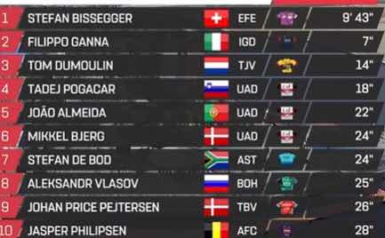 Bissegger ha logrado en la crono de hoy además la primera victoria para el EF esta temporada. Ha mejorado en siete segundos el tiempo de Ganna. Muy cerca también han quedado dos ciclistas que aspiran a todo en la general de la carrera, Tom Dumoulin, muy bien, que ha terminado tercero a 14 segundos, y el vigente campeón del UAE Tour, Tadej Pogacar, que ha sido cuarto a 18 segundos. Otro aspirante a la general, el portugués Joâo Almeida, ha marcado el quinto mejor tiempo, a 22 segundos.