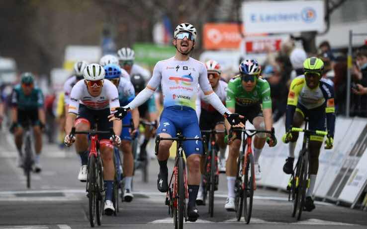 En el último puerto del día atacó Matthew Holmes (Lotto-Soudal), que se unió en cabeza a los últimos supervivientes de la fuga. Tampoco lograron irse hacia adelante. En el descenso se fue hacia adelante Soren Kragh Andersen, del DSM, pero el Trek también echó abajo su intentona. En uno de los repechos finales, quien lo probó fue Mathieu Burgaudeau, del TotalEnergies. Parecía una escapada más destinada a ser neutralizada por el gris pelotón, pero logró sorprender al grupo y se llevó una victoria agónica. El joven ciclista francés, de 23 años, estuvo a punto de ser alcanzado, pero terminó ganando por delante de Pedersen y de Wout Van Aert, que se le echaron encima, pero no lo suficiente como para quitarle su primera victoria como ciclista profesional.