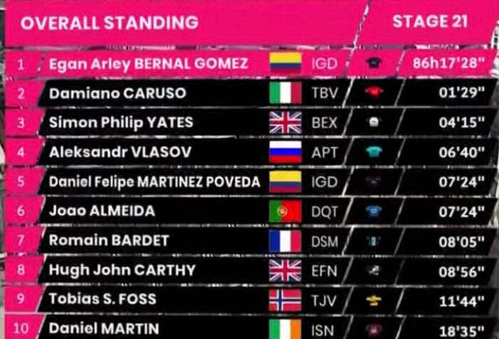 Hoy, último día del Giro, es momento de hacer balance de una carrera que tiene otros nombres propios. Por ejemplo, Damiano Caruso, bravísimo, que ganó la etapa de ayer y que termina segundo en la general. El corredor italiano asumió el rol de líder de su equipo tras la retirada de Mikel Landa, por culpa de una caída. Gregario convertido en jefe de filas, ha hecho la carrera de su vida, un rendimiento soberbio en la carrera de casa que nunca olvidará. Junto a Bernal y Caruso estuvo en el podio Yates, quien al final no pudo consumar esa rebelión ante Bernal que apuntó el día que el líder estalló, pero salvo el día gracias a Daniel Felipe Martínez.